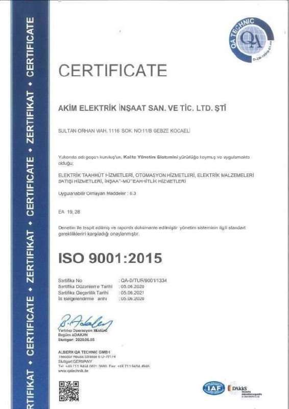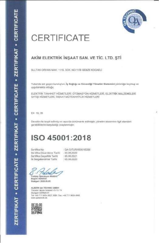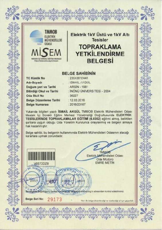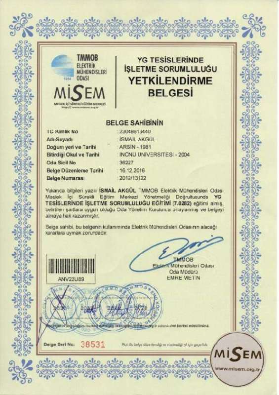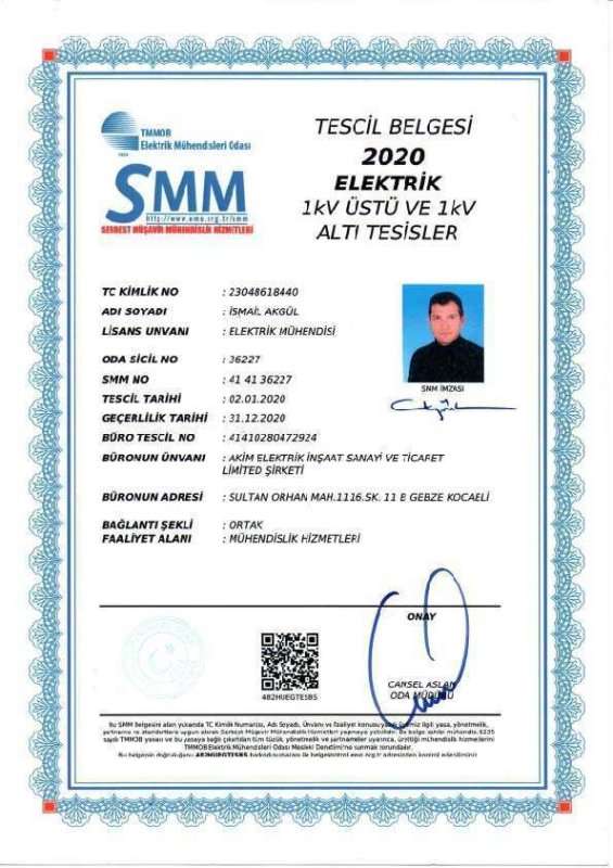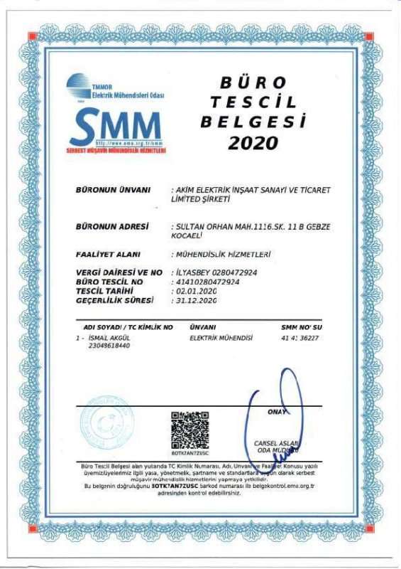 ISO 9001 ISO 45001 Büro Tescil Belgesi 2020 SMM Tescil Belgesi 2020 Topraklama Yetkilendirme Belgesi YG İşletme Sorumluluğu Yetki Belgesi 2020 Enerji Yöneticisi Belgesi Sanayi